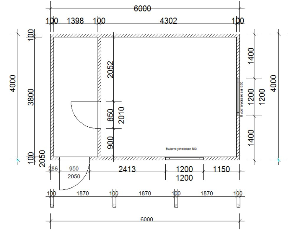 - Каркас стен: высота 2500 мм, толщина 100 мм; доска 50х100 мм;