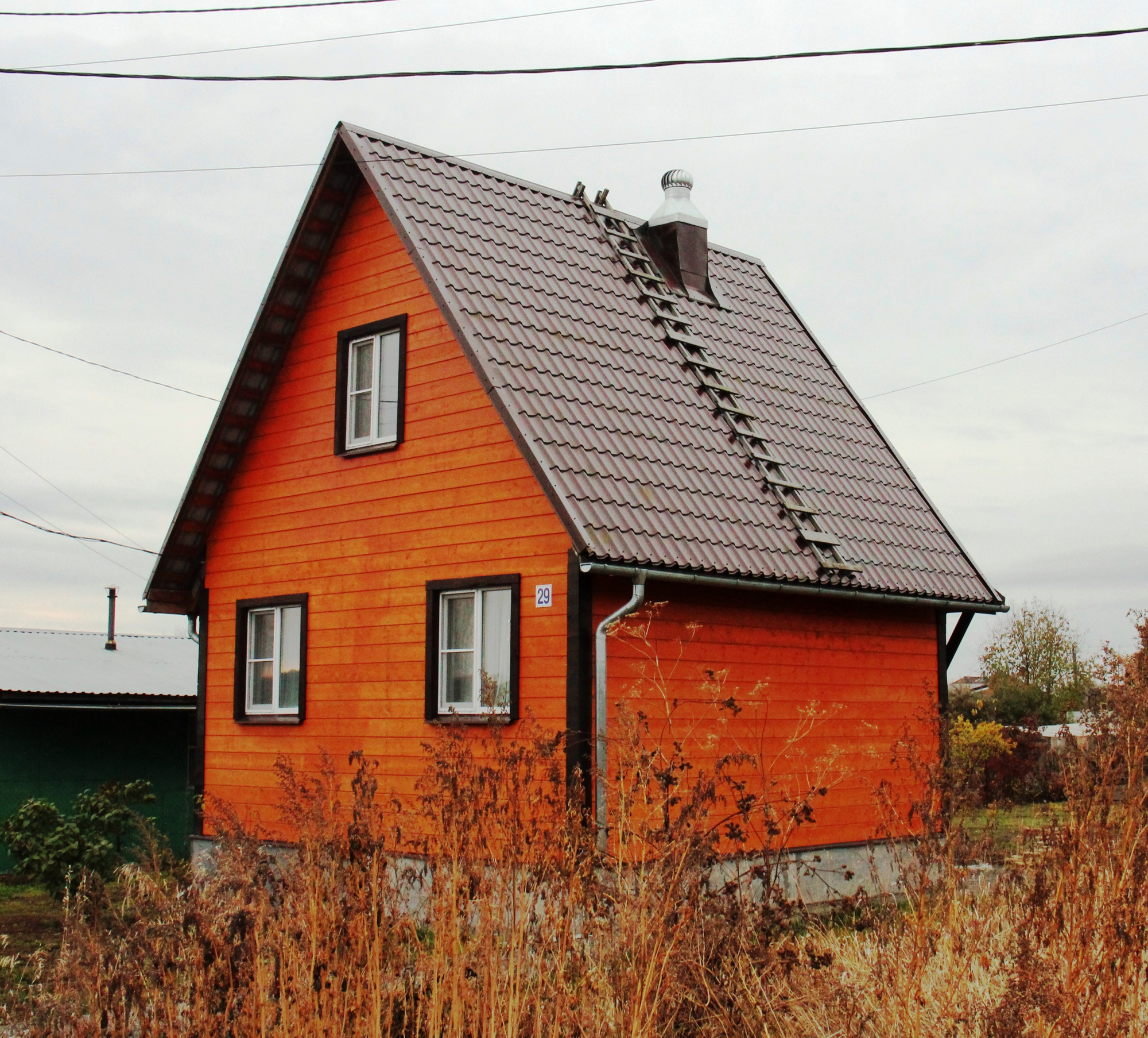 - Кровля: двухскатная металлочерепица Мотеррей 0.45 цвет «шоколад»;