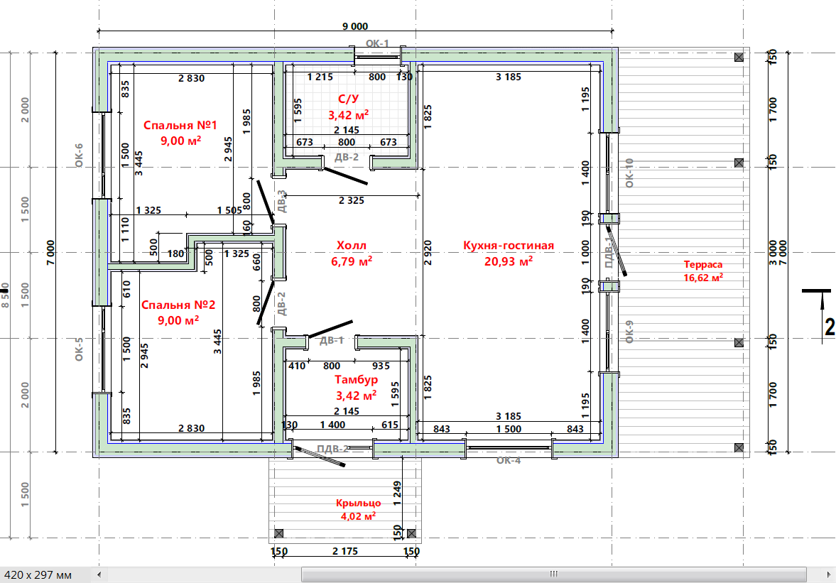 Комплектация каркасного дома 7 х 9 м с верандой 2.5 х 7 м и крыльцом 1.5 х 2.5 м