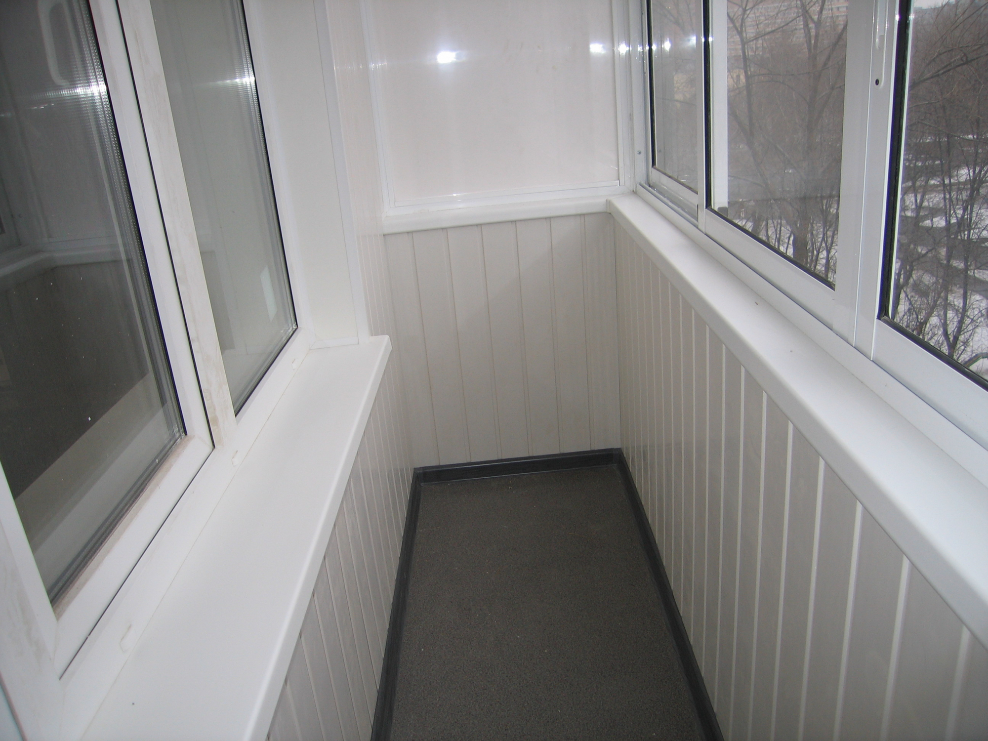 Немаловажно сделать наружную обшивку балкона по перилам. Мы предлагаем сделать это белым профлированным листом.
