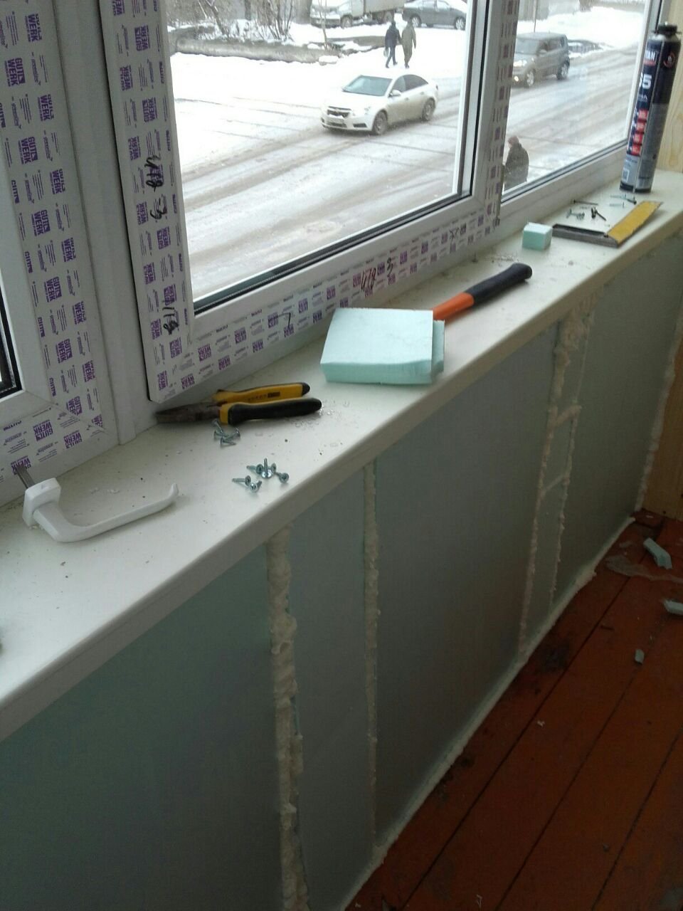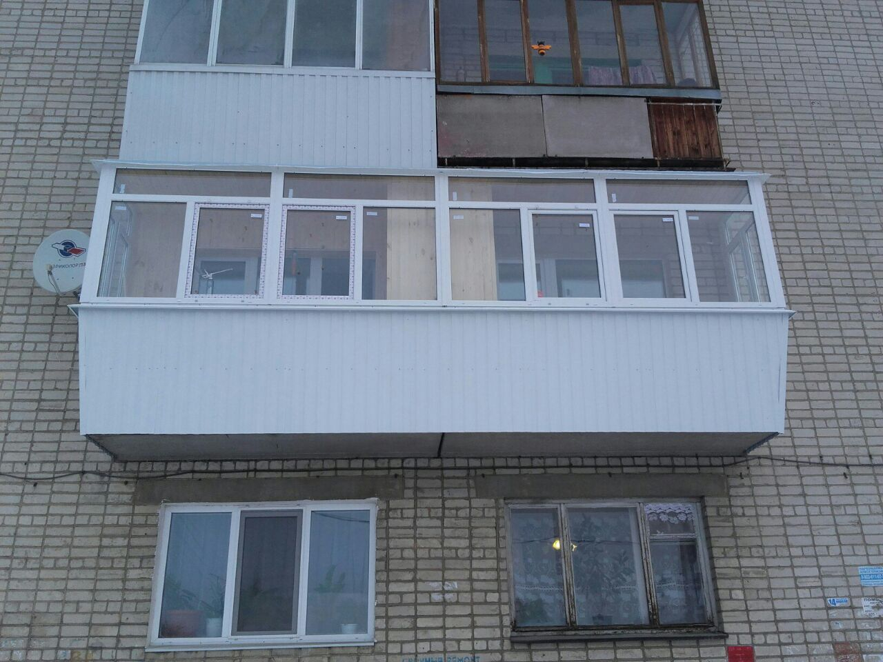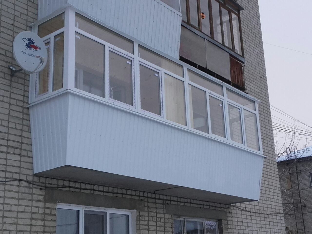 Для увеличения площади балкона, увеличения поступления света, смонтирована выносная конструкция по подоконнику.