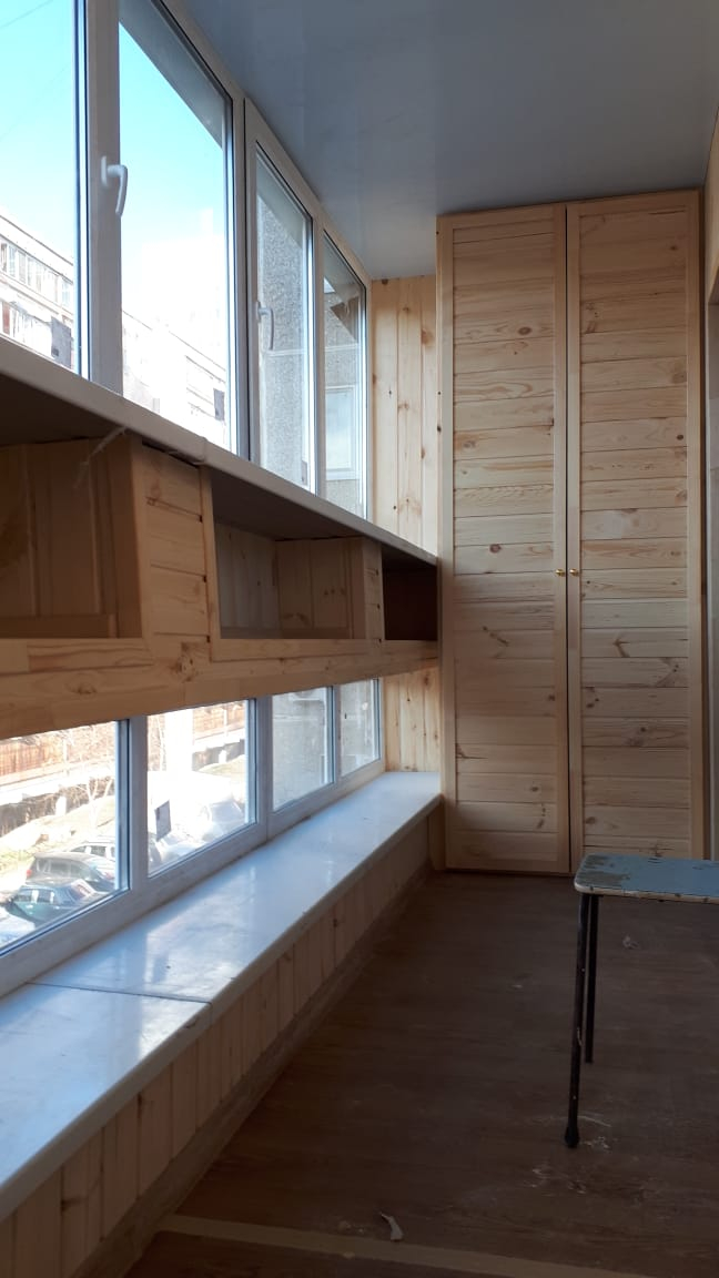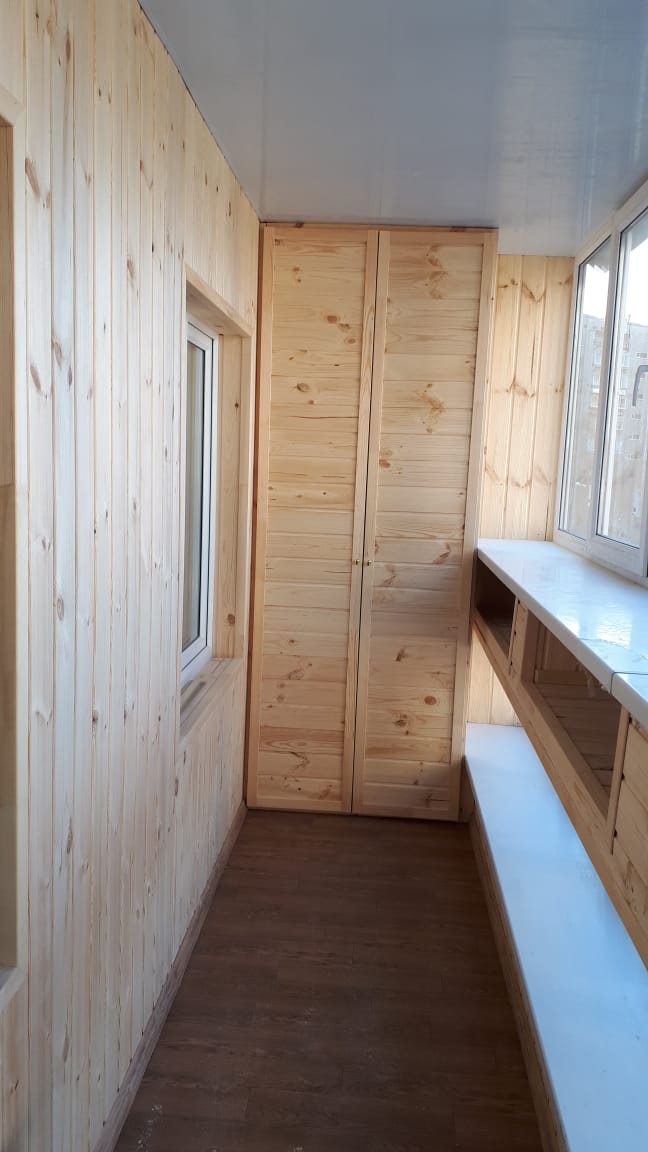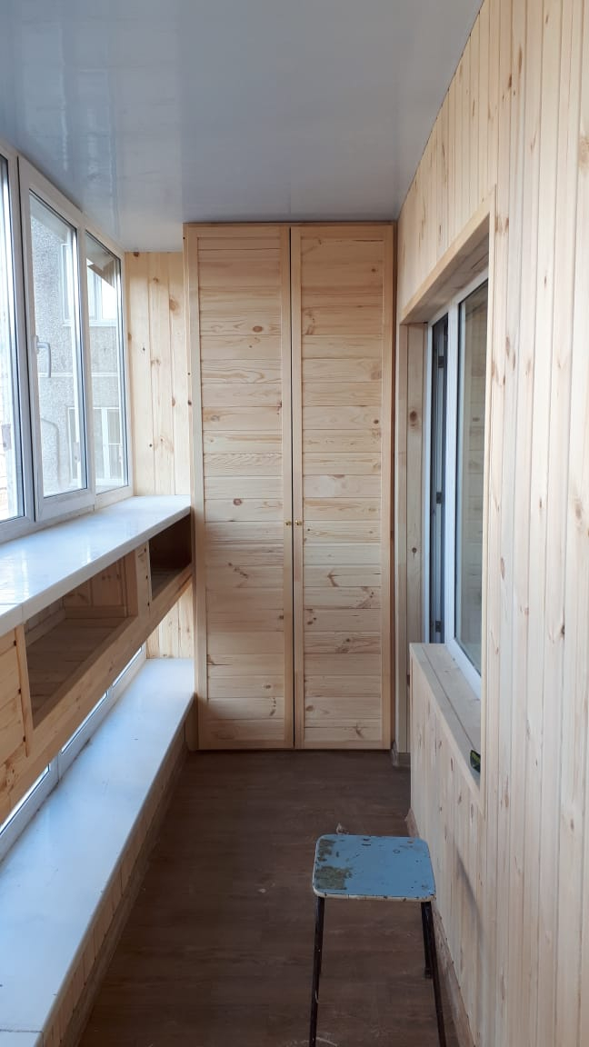 Итак, здесь у нас. Остекление – окна ПВХ с однокамерным стеклопакетом. Внутренняя отделка – евровагонка с сучком класса «А». По потолку – белая пластиковая панель. Фанерный пол застелен ламинатом, приобретенным заказчиком. И в завершении образа – два вместительных шкафа «в потолок» с распашными дверцами.
