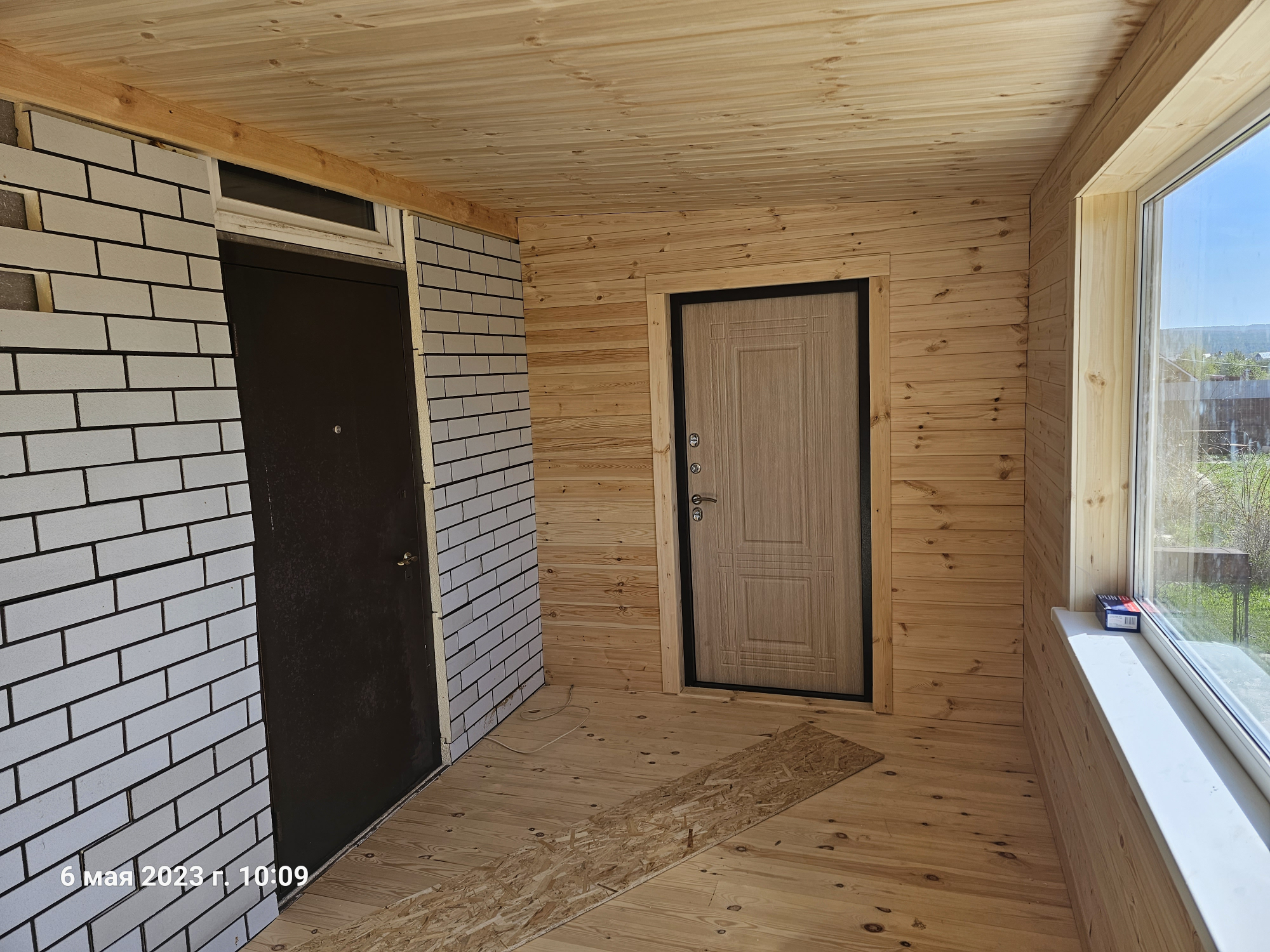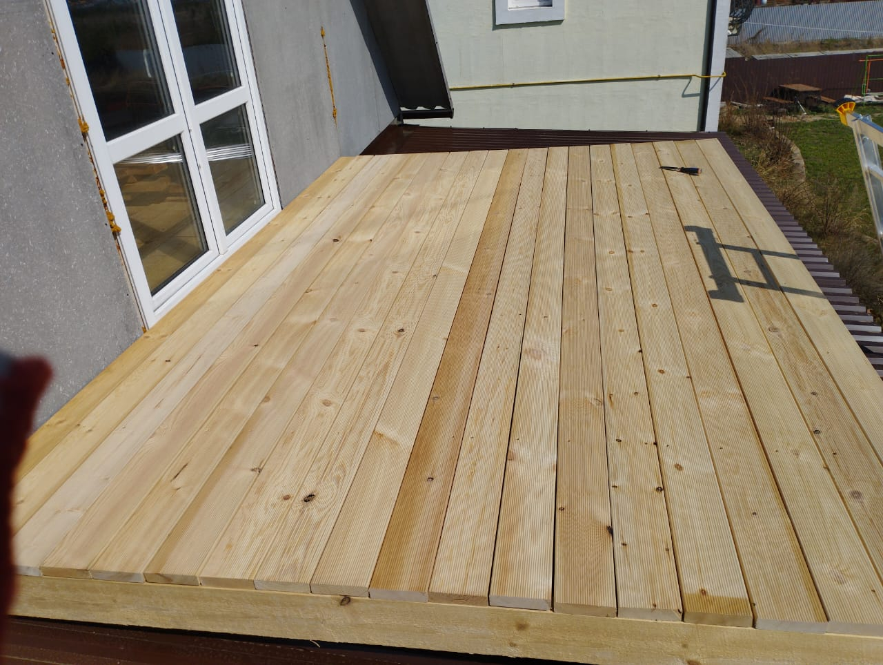 - Настил пола в тамбуре - доска пола шпунтованная камерной сушки 28мм, сосна, сорт АВ; на веранде и балконе - доска террасная/палубная 34мм, хвоя, сорт АВ;