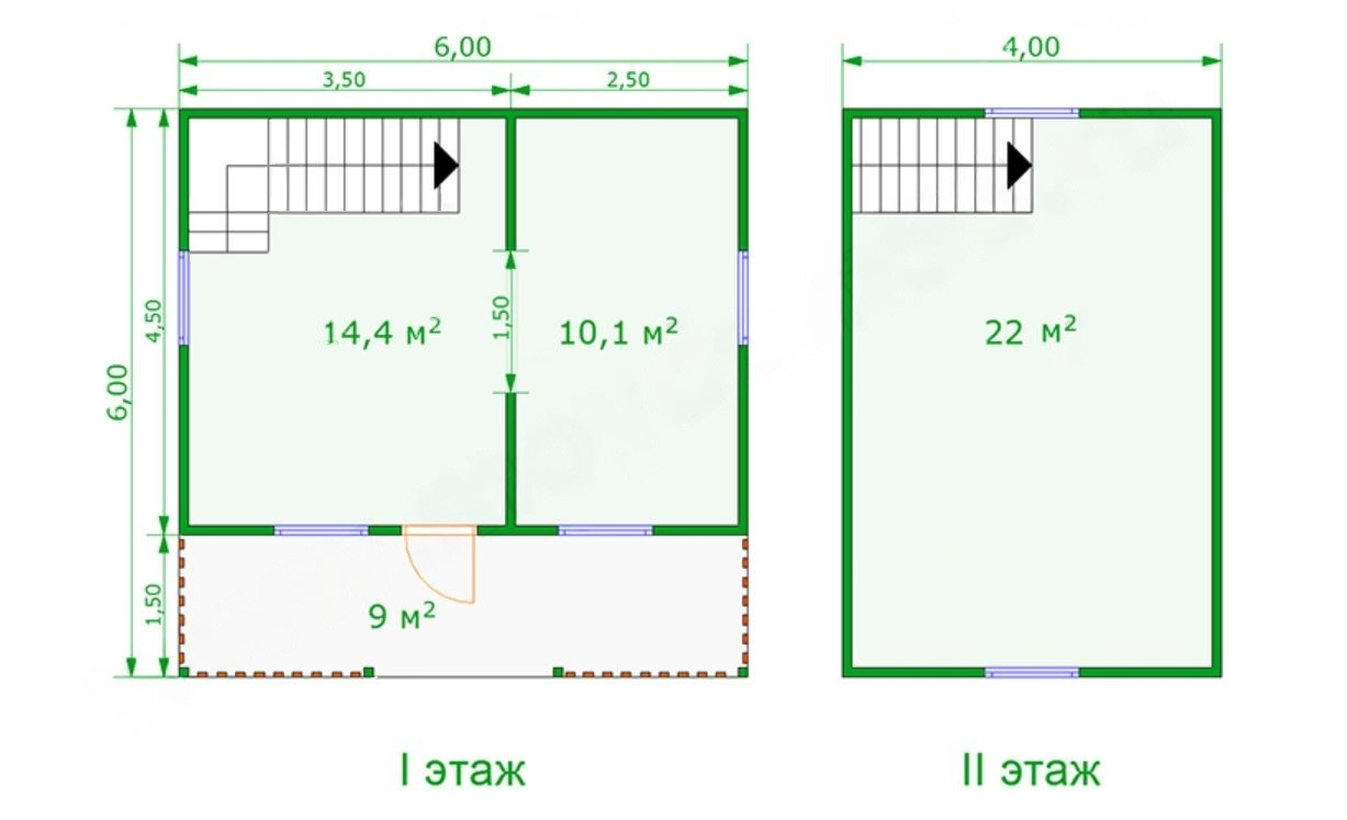 Проект каркасного дома 4.5м х 6м с мансардным этажом 4м х 6м и верандой 1.5м х 6м