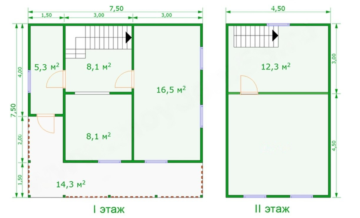 Проект каркасного дома 6м х 6м с мансардным этажом 4.5м х 7.5м и угловой верандой 1.5м х 15м