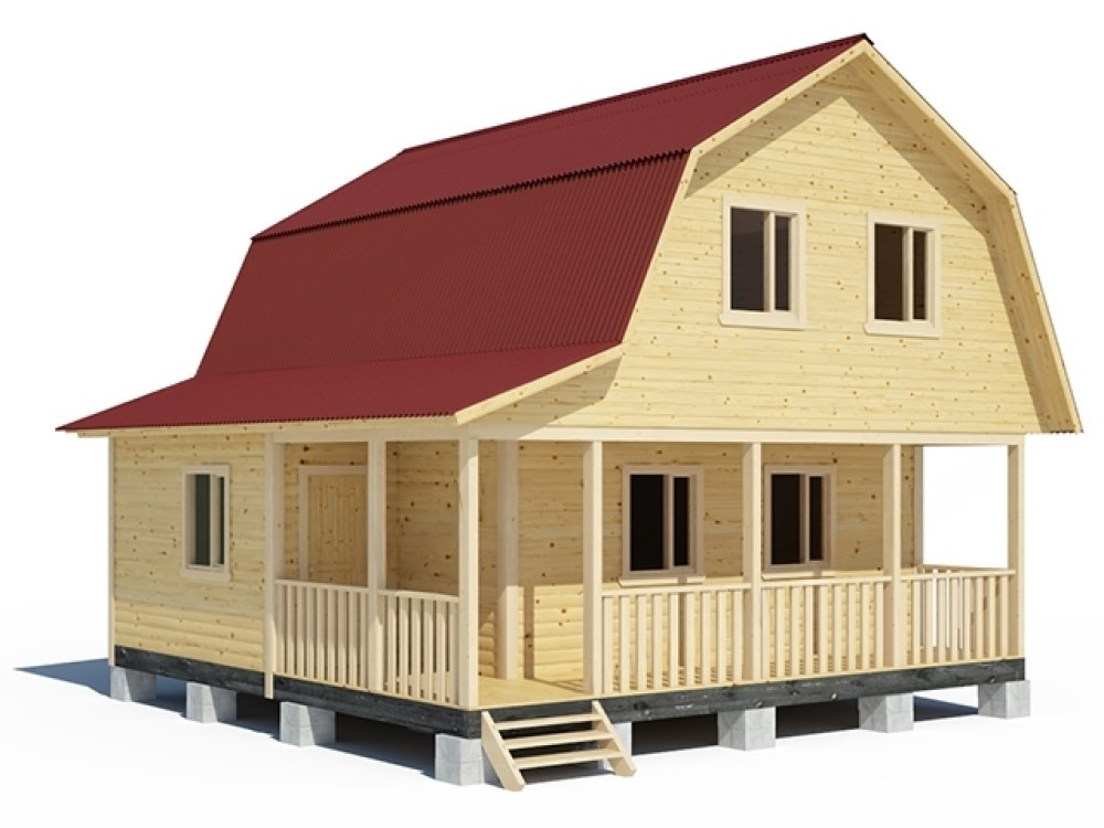 Еще один вариант каркасного дачного дома 6х6, но мансардный этаж здесь уже 4.5х7.5. Благодаря ломаной крыше этаж становится не только больше по площади, но и комфортнее для размещения в целом. Веранда здесь заведена под мансарду. Что непременно служит украшением не только дома, но и ландшафта участка в целом. Внутри дома - комфортная планировка, лестница на второй этаж расположена в центре.