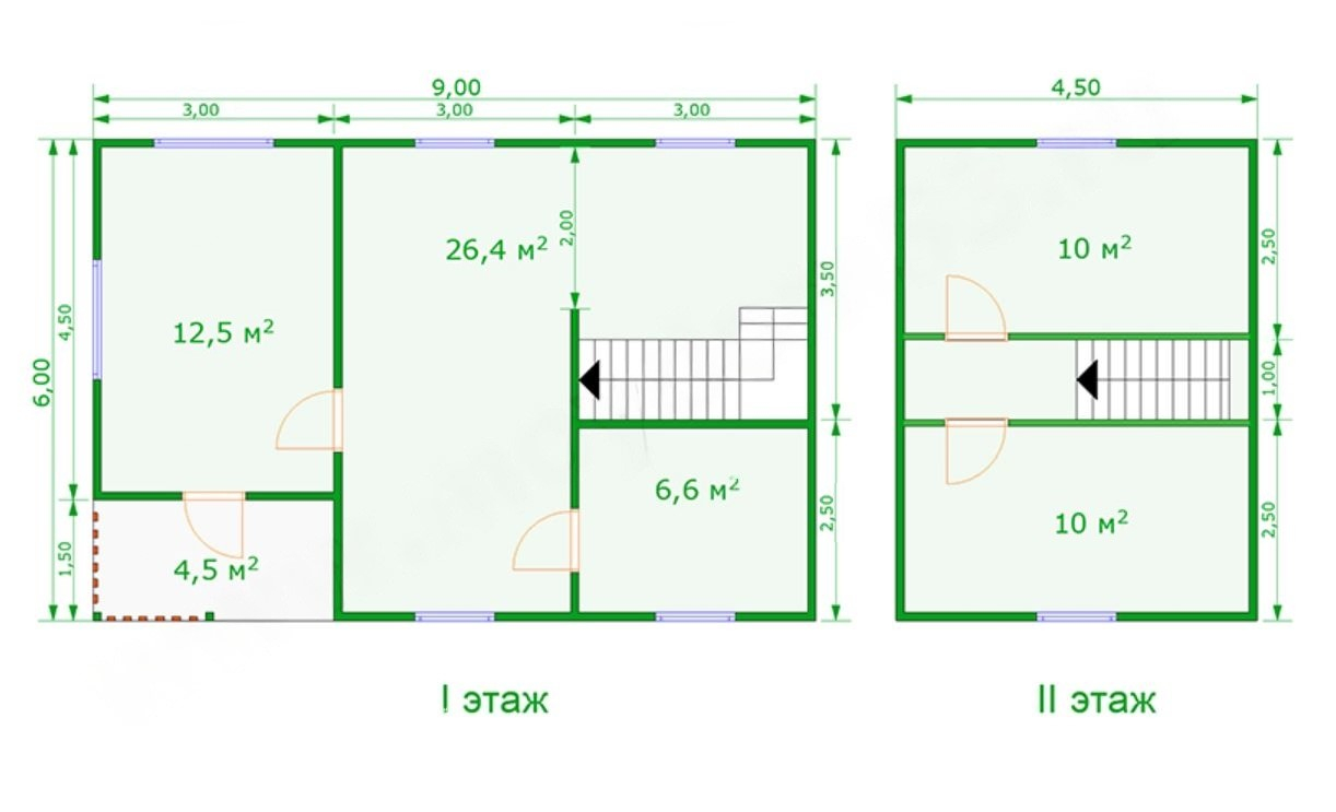 Проект каркасного дома 6м х 6м с мансардным этажом 4.5м х 6м и теплым тамбуром 3м х 6м и верандой-крыльцом 1.5м х 3м