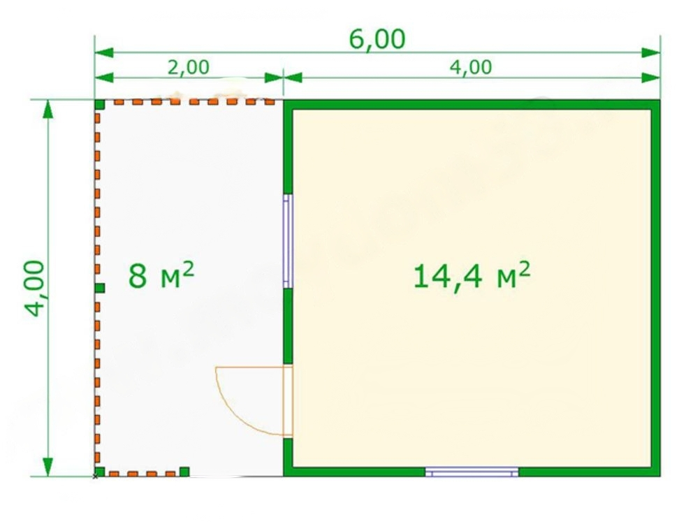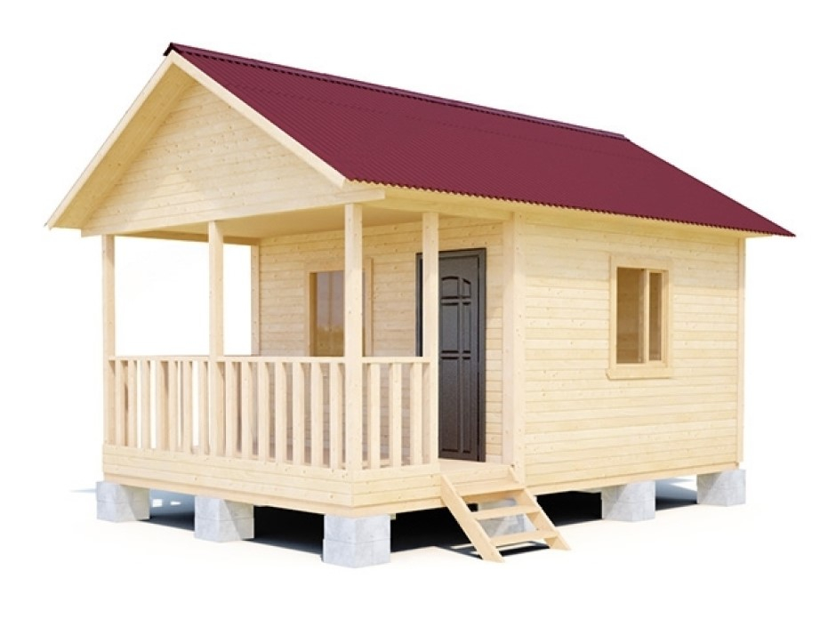Дом 4х4м с верандой, на наш взгляд, прекрасный компактный, но функциональный вариант дома для размещения на садовом участке. Веранда при ширине 2 метра может вместить небольшую зону для чаепития. При желании, наверху можно устроить небольшой чердак. А благодаря небольшому весу, в качестве фундамента можно использовать недорогой свайный или блочный вариант.