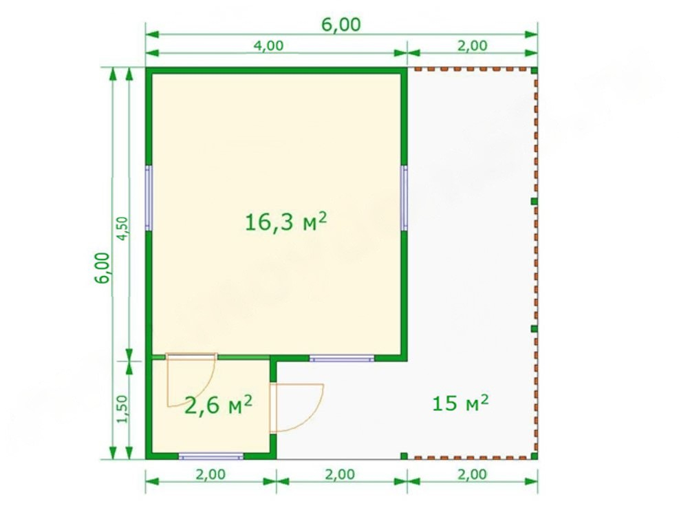 Проект каркасного дома 4м х 6м с угловой верандой 1.5м х 2м + 2м х 6м