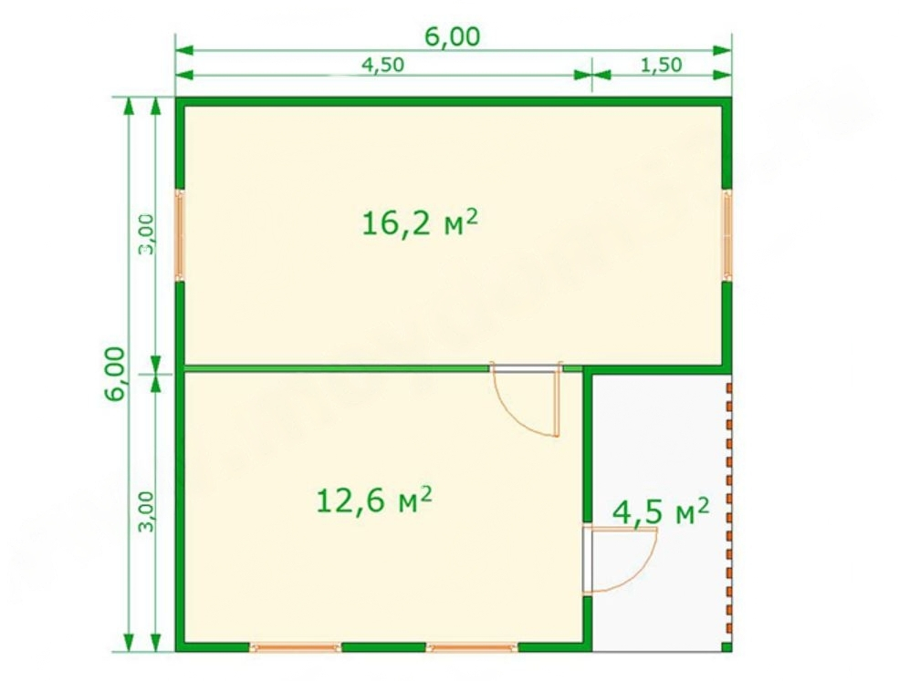 Проект каркасного дома 6м х 6м с верандой-крыльцом 1.5м х 3м