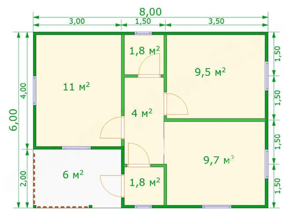 Проект каркасного дома 6м х 8м с верандой-крыльцом 2м х 3м