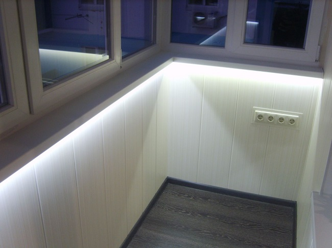 Что касается освещения, то точечно можно вывести его как на потолок, так и на фасадную стену балкона. А если у вас есть другие идеи, например пустить диодную лампу под подоконником (как на фото), давайте реализуем!